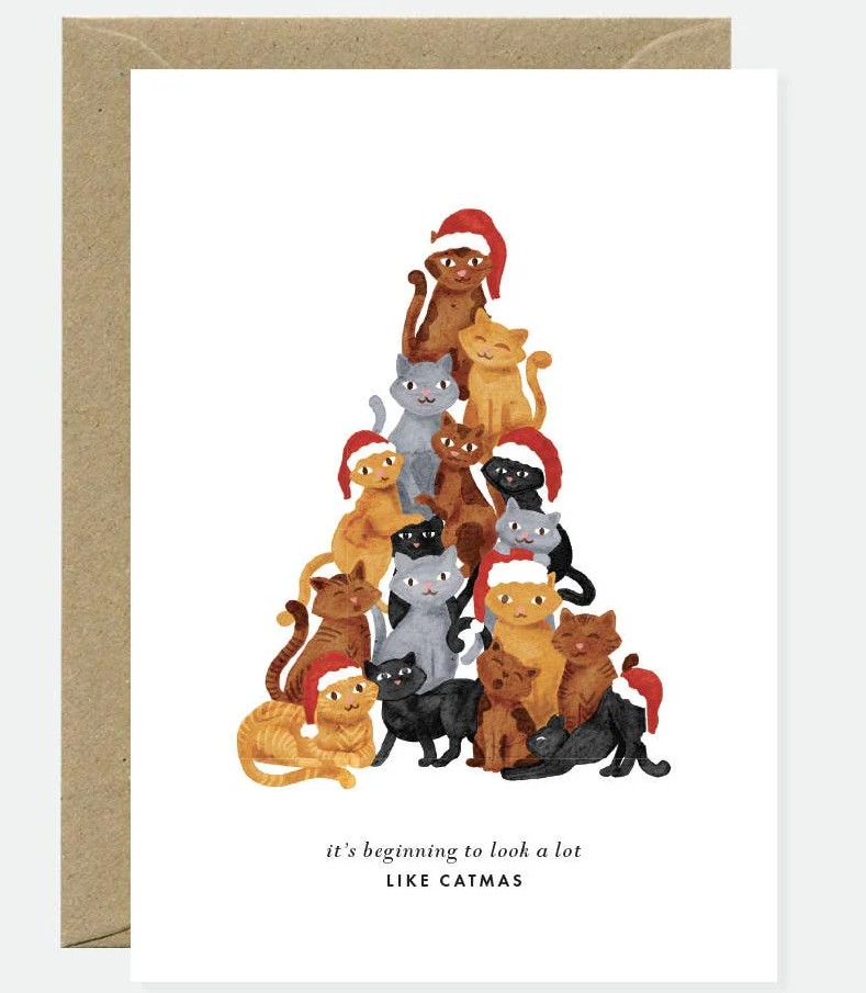 Ça commence à vraiment ressembler à un Catmas ! La carte Catmas d’All the Ways to Say propose un design festif et amusant avec une pyramide de chats adorables coiffés de bonnets de Noël, empilés comme un sapin. Une illustration pleine d’humour et de tendresse pour les fêtes.