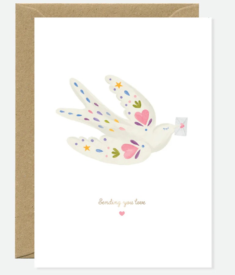 Un tendre message venu du c◊ur. La carte Sending Love Bird d’All the Ways to Say met en scène une colombe porteuse d’une enveloppe, décorée de motifs colorés et sublimée par des détails en dorure. Une manière poétique de transmettre amour, soutien ou réconfort.